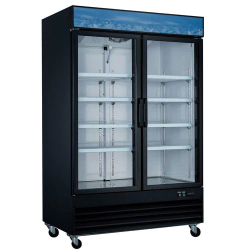 Showcase your soda and food in this 53" 2 glass door refrigerated merchandiser with LED lighting, 8 adjustable shelves, and heavy-duty lockable wheels standard. 2 self-closing anti-fog swing door provides easy access to your products. Standard 115V plug makes set up easy. Just plug it in and turn it on!